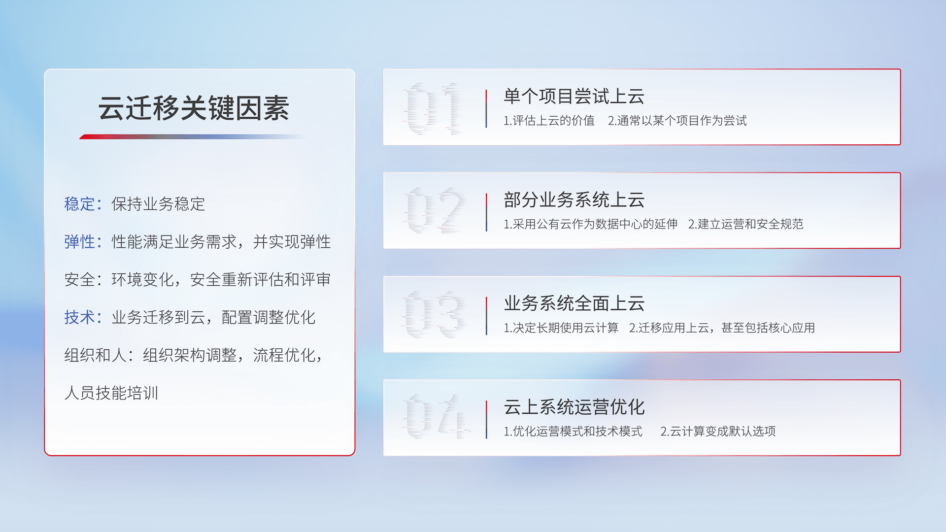 结合实际业务,,,从规划设计、、、、云平台选型、、云原生改造、、、数据迁移、、集成交付,,,,迁移全过程为客户识别最佳上云路径,,做好风险识别管理,,设计网络架构、、、身份权限、、安全审计合规、、、操作审计、、、日志审计、、监控告警策略、、多站点容灾设计等,,,对云上基础设施进行整体规划,,,提升IT治理水平,,以满足弹性、、高可用、、高性能的需求。。