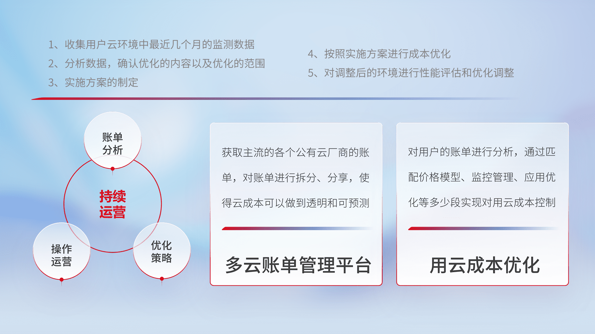 通过多云纳管,,以统一的资源数据模型把客户的云资源进行抽象和封装,,,,进而实现对多云资源的统一操作,,,保障云资源管理的可靠性、、、、稳定性与可用性。。。量身定制化运维内容,,,,配置、、、开发运维、、、、补丁管理、、备份、、、、监控、、认证和访问管理、、、、审计和日常巡检等,,保障在用云过程中的可靠度,,稳定度以及高可用率。。